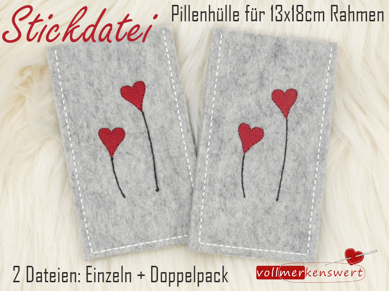 Mit diesem tollen Stickdateien-Set kannst Du entweder eine oder 2 Pillenhüllen in einem Stickvorgang im 13 x 18 cm Stickrahmen sticken.