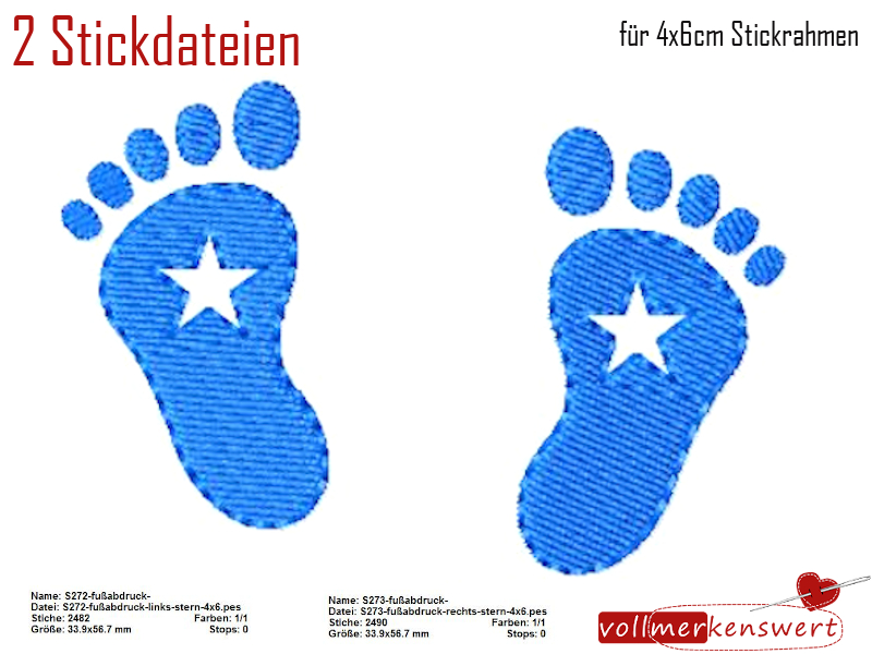 2 Stickdateien Fußabdruck Stern links und rechts im Set für den 10x10cm Stickrahmen S272+S273-set-01