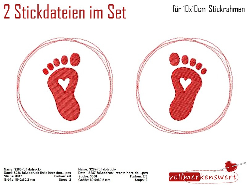 Hier bekommst 2 Stickdateien im Set um Deine Werke mit diesen süßen Fußabdrücken zu besticken.