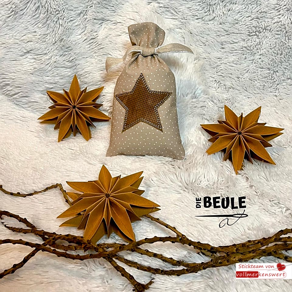 Diese schlichten und zeitlosen Adventskalender-Beutel mit Stern werden komplett in der Stickmaschine gestickt. Der Beutel ist innen gefüttert und du brauchst nur noch eine kleine Wendeöffnung per Hand schließen, falls du das möchtest. Es ist aber nicht unbedingt nötig.