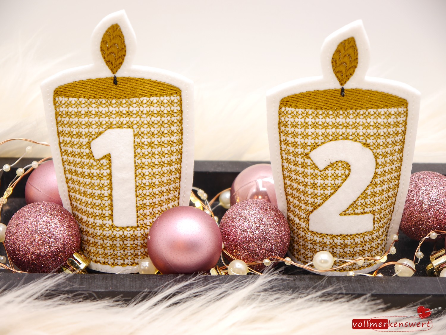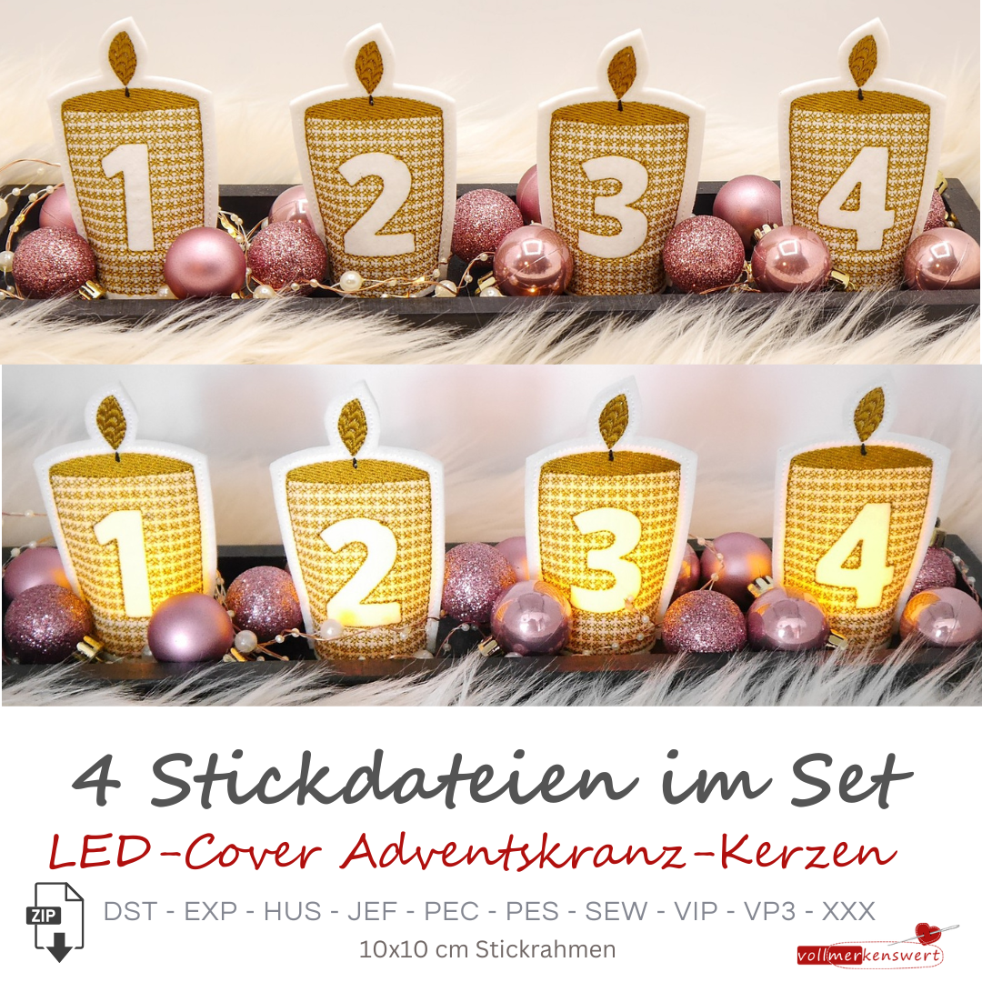 Da nicht überall echte Kerzen möglich sind, haben wir diese 4 Stickdateien als LED-Cover-Kerzen erstellt.