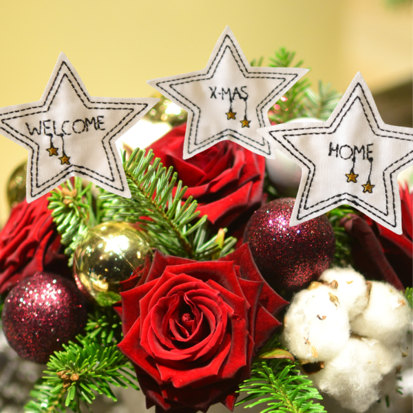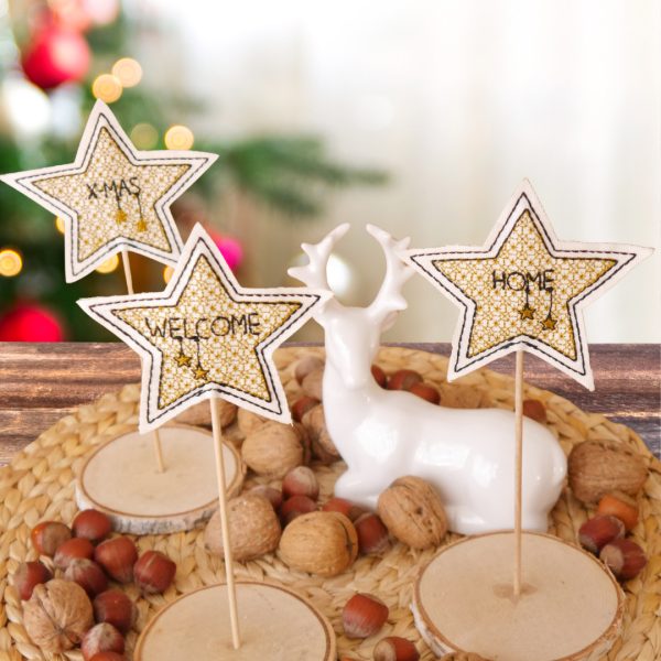 Sie werden als ITH-Stickdatei im Doodle-Style erstellt. Die Ränder der Sterne fransen -je nach Stoff- etwas aus; dieser Effekt ist ausdrücklich so erwünscht!