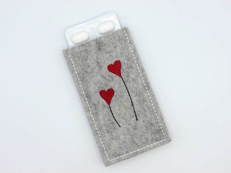 Wunderschönes und praktisches Etui für Tablettenbliester bis max. 5 x 10,5 cm, gefertigt aus 3 mm starkem Wollfilz und hochwertig mit unserer eigenen Stickdatei bestickt.