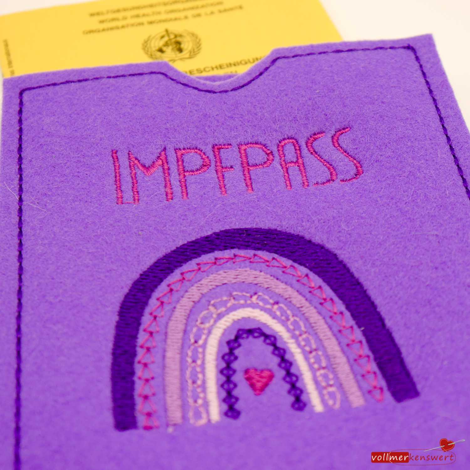 Diese wunderschöne und hochwertige Impfpasshülle haben wir aus 3 mm starkem Wollfilz genäht und mit unserer eigenen Stickdatei "Regenbogen" bestickt.