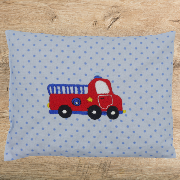 Wir haben die Kissenhülle aus einem hochwertigen Baumwollstoff genäht und mit einem coolen Feuerwehrauto bestickt.
