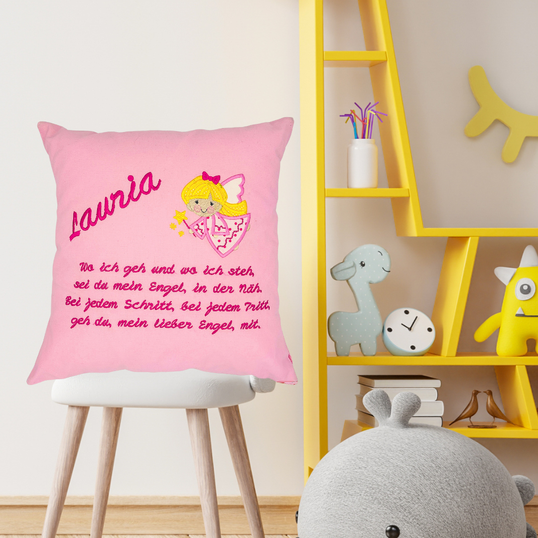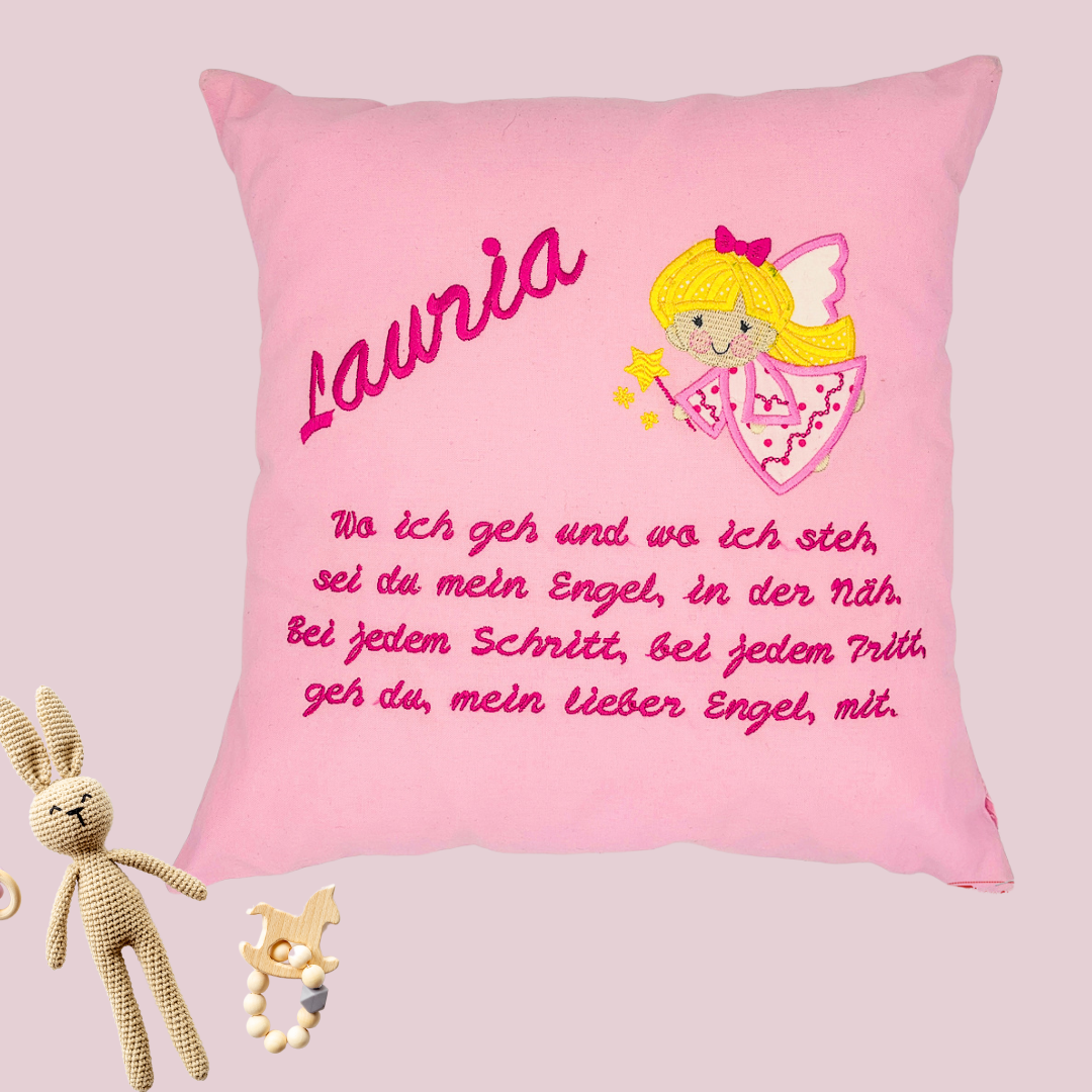 Diese Kissenhülle wurde von uns in sorgfältiger Handarbeit aus einem hochwertigen rosa Baumwollstoff genäht und mit dem Namen Lauria, einem Engel und einem Spruch bestickt.