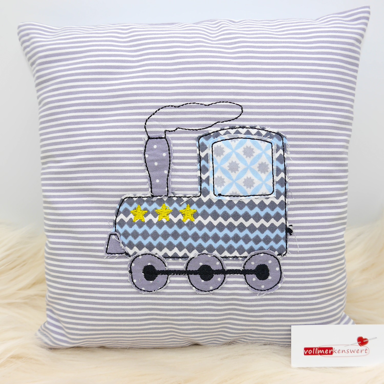 Die Kissenhülle wird von uns in sorgfältiger Handarbeit aus hochwertigen Baumwollstoffen genäht und mit einer Lok-Applikation im Doodle-Style bestickt.