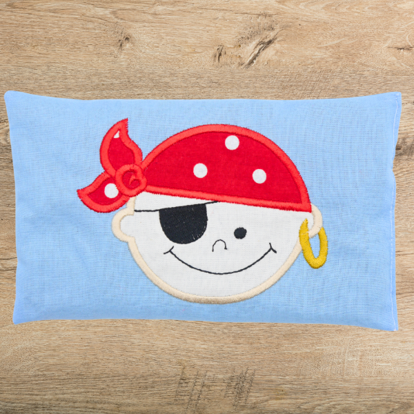 Wir haben das Körnerkissen aus einem hochwertigen Baumwollstoff genäht und mit einer Pirat-Applikation bestickt.
