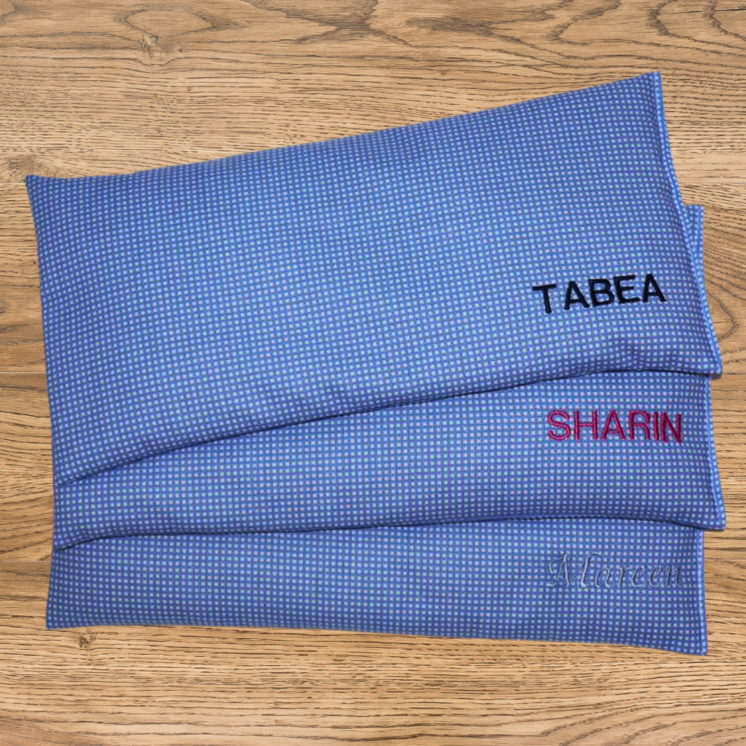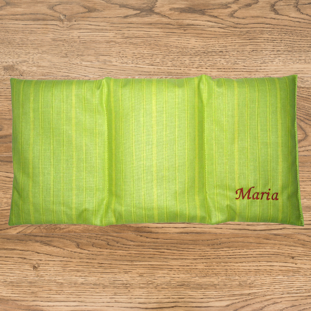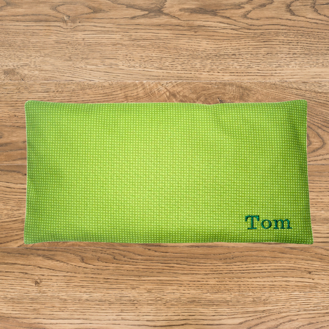 Das Körnerkissen nähen wir aus einem hochwertigen Baumwollstoff und besticken es nach Deinen Wünschen.