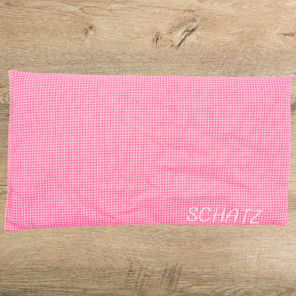 Wir haben das Körnerkissen aus einem hochwertigen Baumwollstoff genäht und mit dem Schriftzug "Schatz" bestickt.