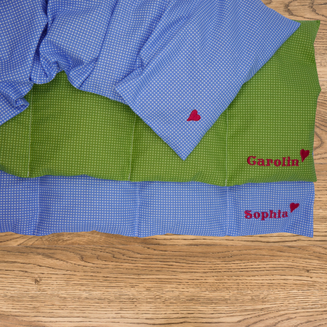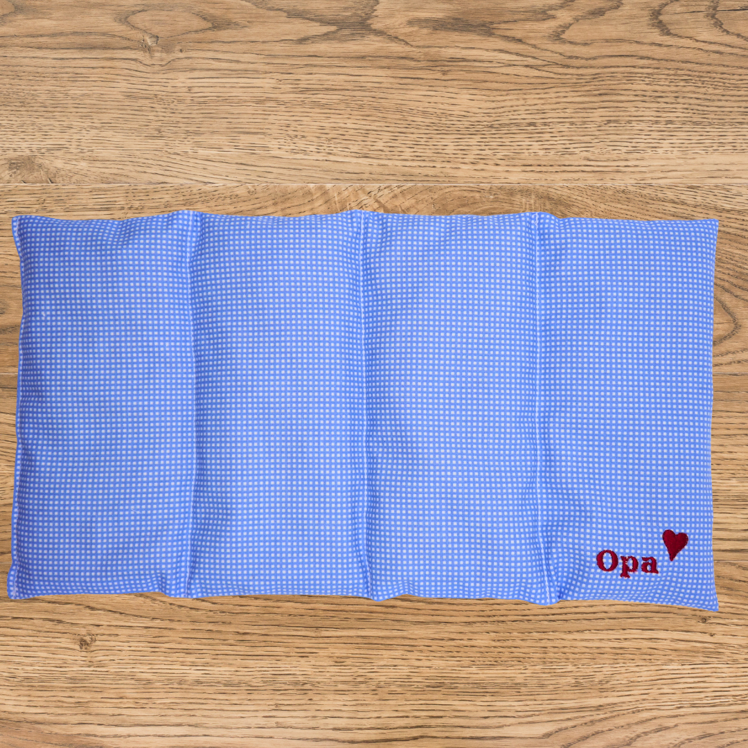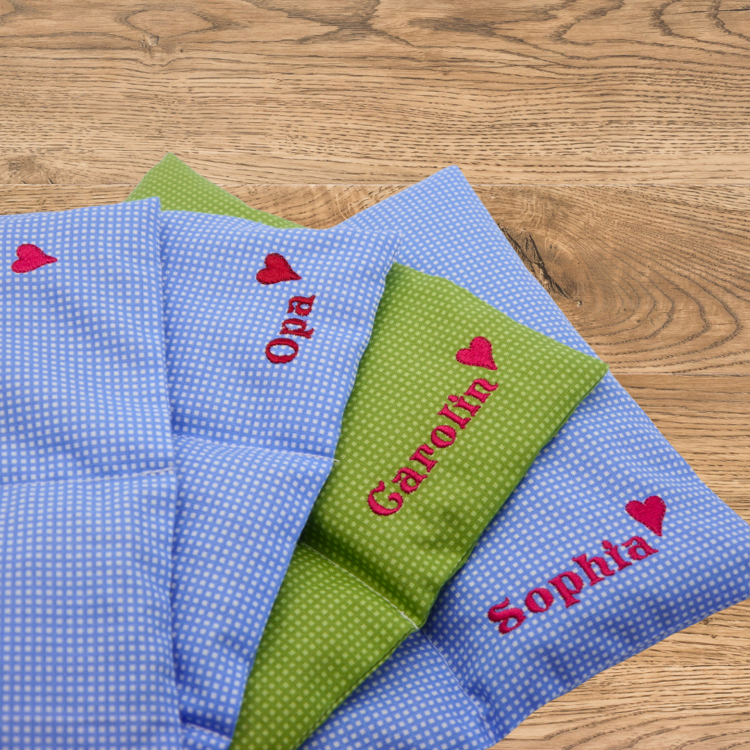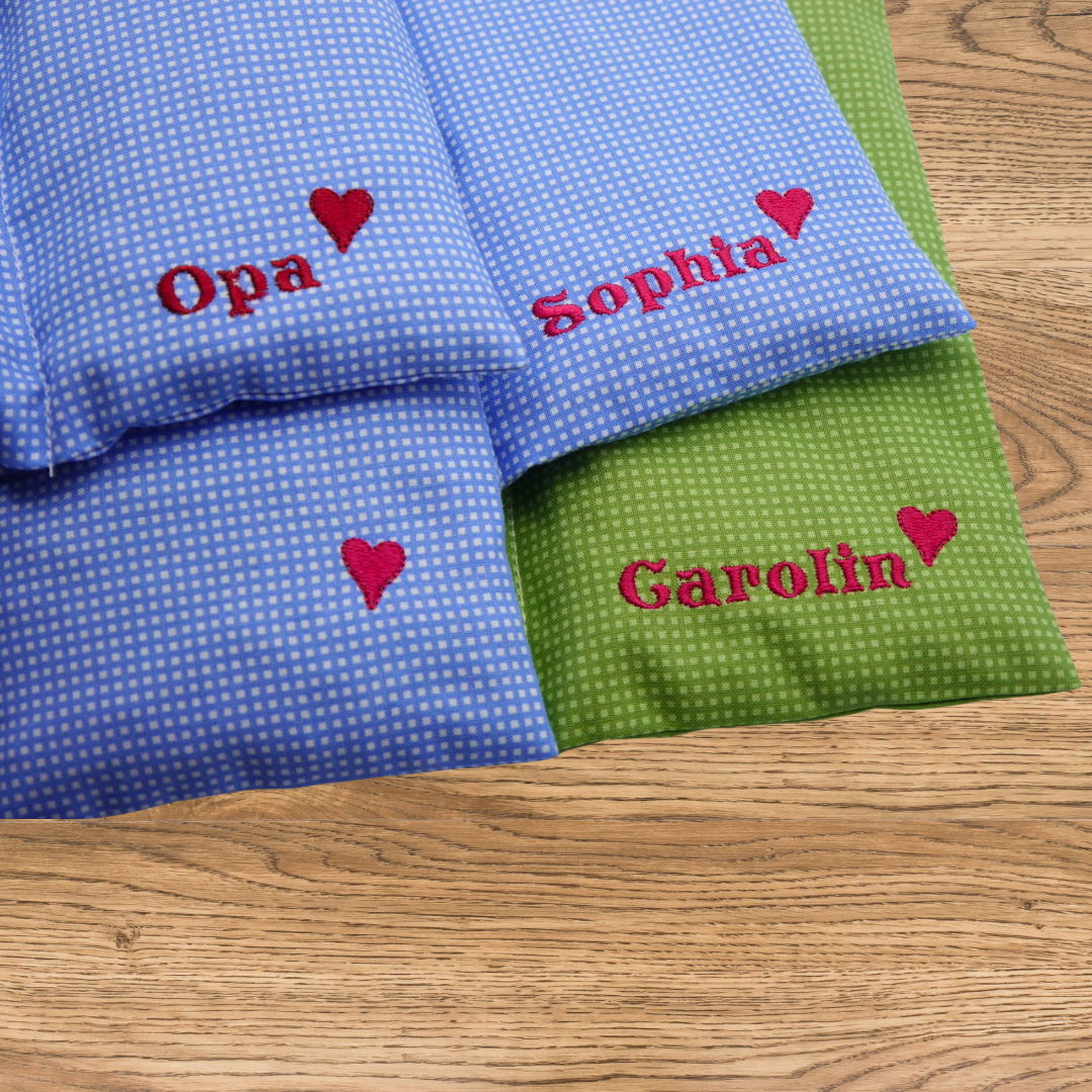 Das Körnerkissen nähen wir aus einem hochwertigen Baumwollstoff und besticken es nach deinen Wünschen.