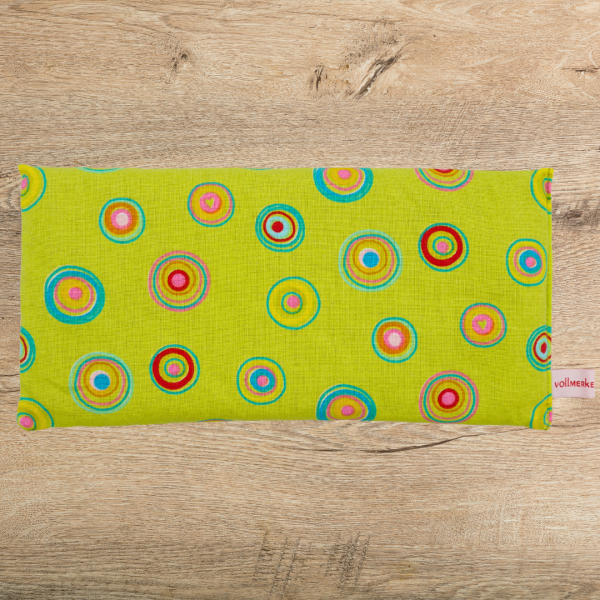 Dieses Körnerkissen haben wir aus einem wunderschönen grünen Baumwollstoff mit Kringeln genäht.