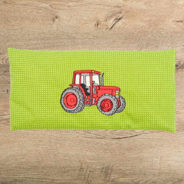Dieses Wärmekissen haben wir aus einem hochwertigen Baumwollstoff genäht und mit einem Traktor-Stickmuster bestickt.