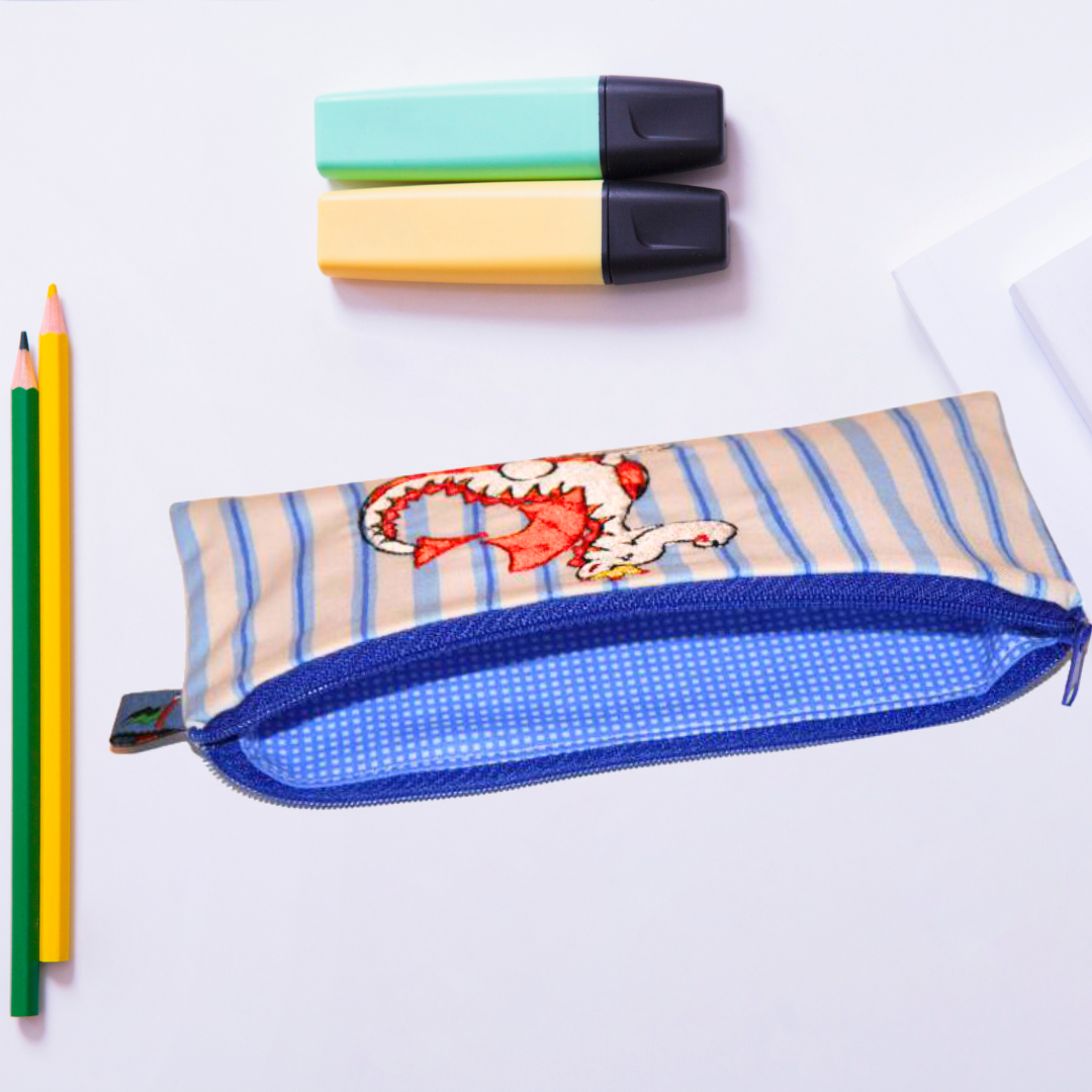Dieses kleine Reißverschluss-Täschchen haben wir mit einem wunderschönen Drachen-Stickmuster bestickt.