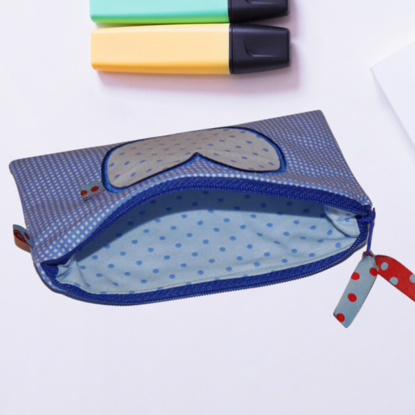 Für die Tasche haben wir 2 hochwertige Baumwollstoffe gewählt. Innen ist das Mäppchen ohne sichtbare Nähte. Verschlossen wird das Täschchen mit einem Reißverschluss.