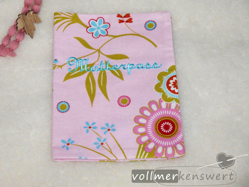 Als Stoff haben wir einen wunderschönen Baumwollstoff mit Blumenmuster gewählt und mit dem Schriftzug "Mutterpass" bestickt.