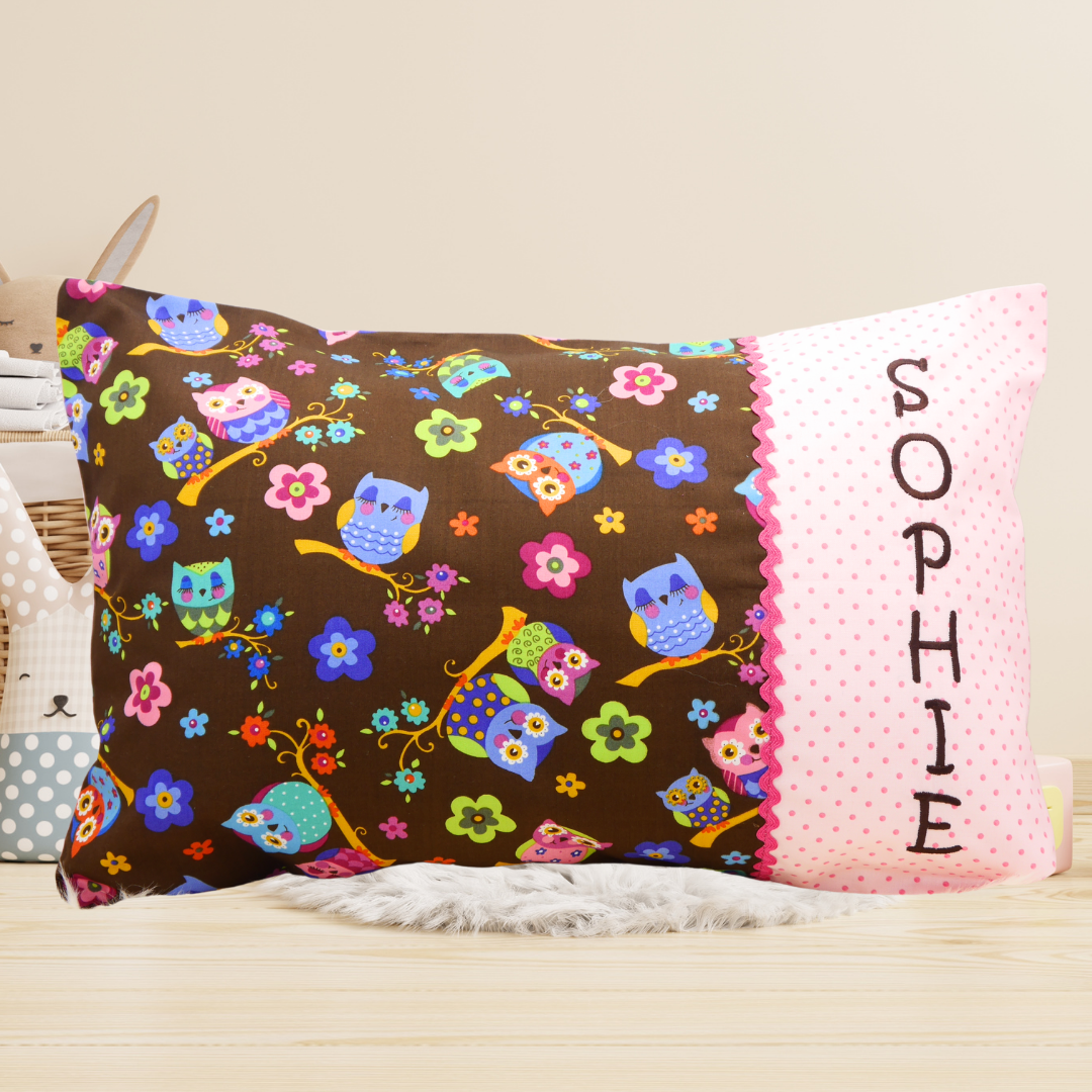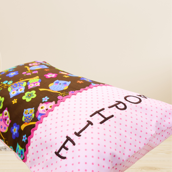 Die Kissenhülle wird von uns in sorgfältiger Handarbeit aus hochwertigen Baumwollstoffen genäht und mit einem Wunschnamen (bis max. 10 Buchstaben) und -auf Wunsch- mit einer Zackenlitze aufgepeppt.