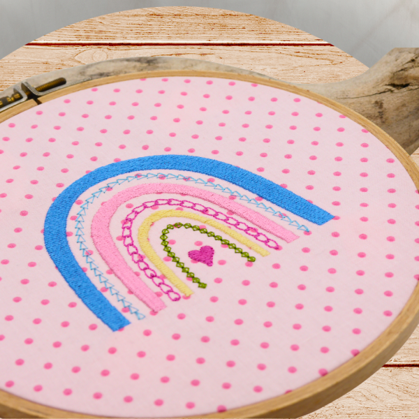 Dieser Boho-Regenbogen ist schnell gestickt und begeistert schnell kleine und große Regenbogen-Liebhaber.