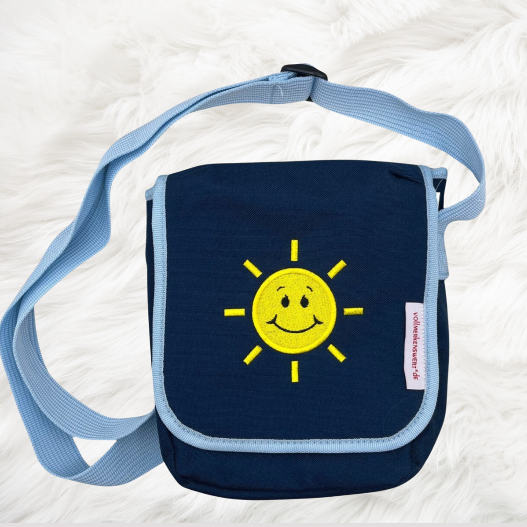 Schultertasche Sonne bestickt -mit Wunschname möglich (personalisiert) - Taschenfarbe:blau -sofort lieferbar-