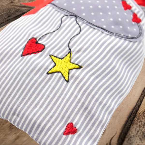 Du bekommst das Stickmuster mit einem "Blanko-Doodle-Button", d. h. hier kannst du selber einen Namen, Text oder Zahl (z. B. für einen Adventskalender 1 - 24) einfügen. So kannst du für deine Lieben ganz persönliche Geschenkverpackungen fertigen, welche wiederverwendbar sind. Die Bindebänder sind fest angebracht, sodass diese nicht verloren gehen.