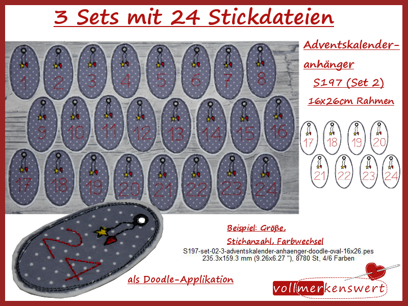 Stickdatei-Set 24 Adventskalenderzahlen Anhänger für Adventskalender im Doodle-Rahmen 1-24 für 16x26cm Stickrahmen S197-set-02