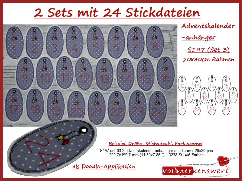Stickdatei-Set 24 Adventskalenderzahlen Anhänger für Adventskalender im Doodle-Rahmen 1-24 für 20x30cm Stickrahmen S197-set-03