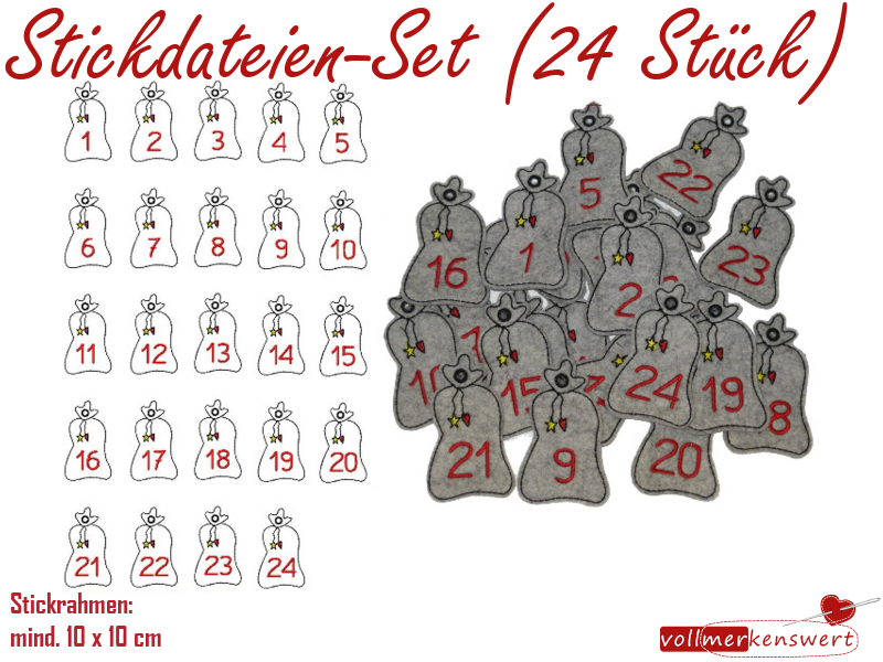 Stickdatei-Set 24 Anhänger für Adventskalender Geschenkesack 1-24 für 10x10er Rahmen S019
