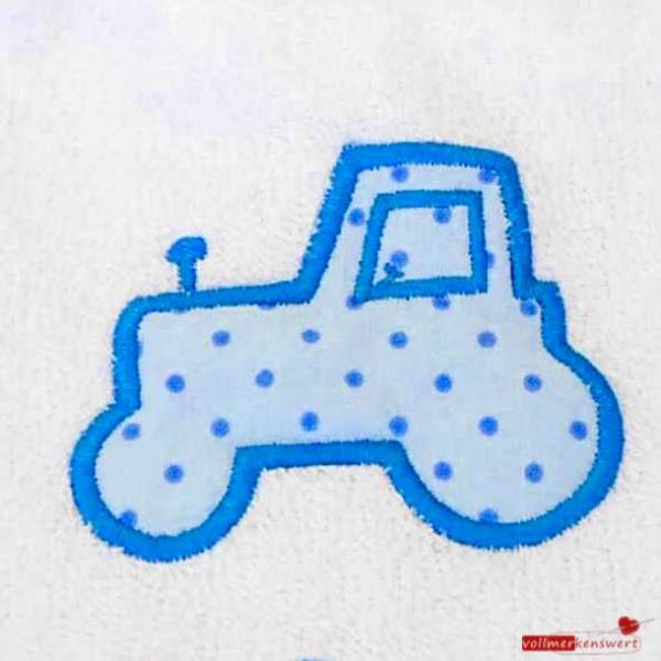 Diese hübsche Traktor-Stickdatei haben wir für als Applikations-Stickmuster erstellt. Sie sieht super auf Lätzchen, Kissen, Decken, Taschen und vielen weiteren Artikeln -nicht nur für Kinder- aus.