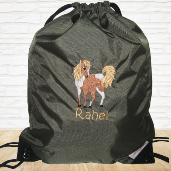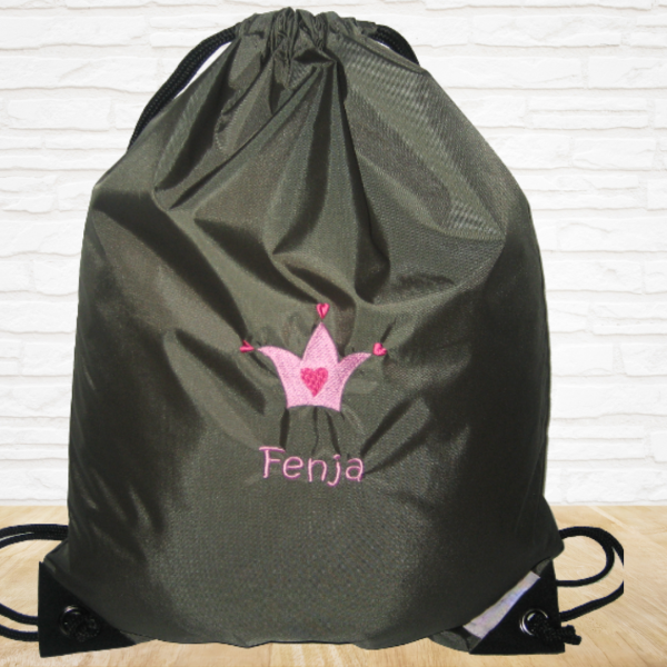 Nicht nur zum Sport ein praktischer Begleiter: der hübsche und zugleich nützliche Turnbeutel wird mit einem Stickmotiv deiner Wahl und einem Namen bestickt.