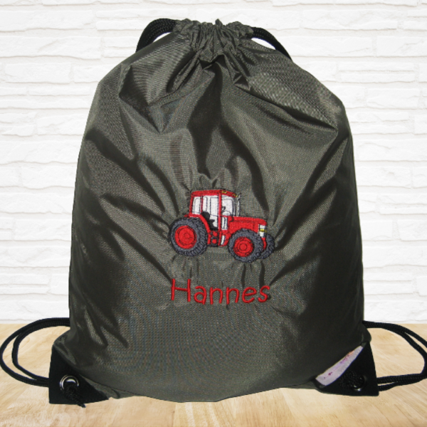 Turnbeutel "Sporty" mit Wunschmotiv und Name bestickt für Kindergartenkinder & Große -personalisiert- Farbe: oliv