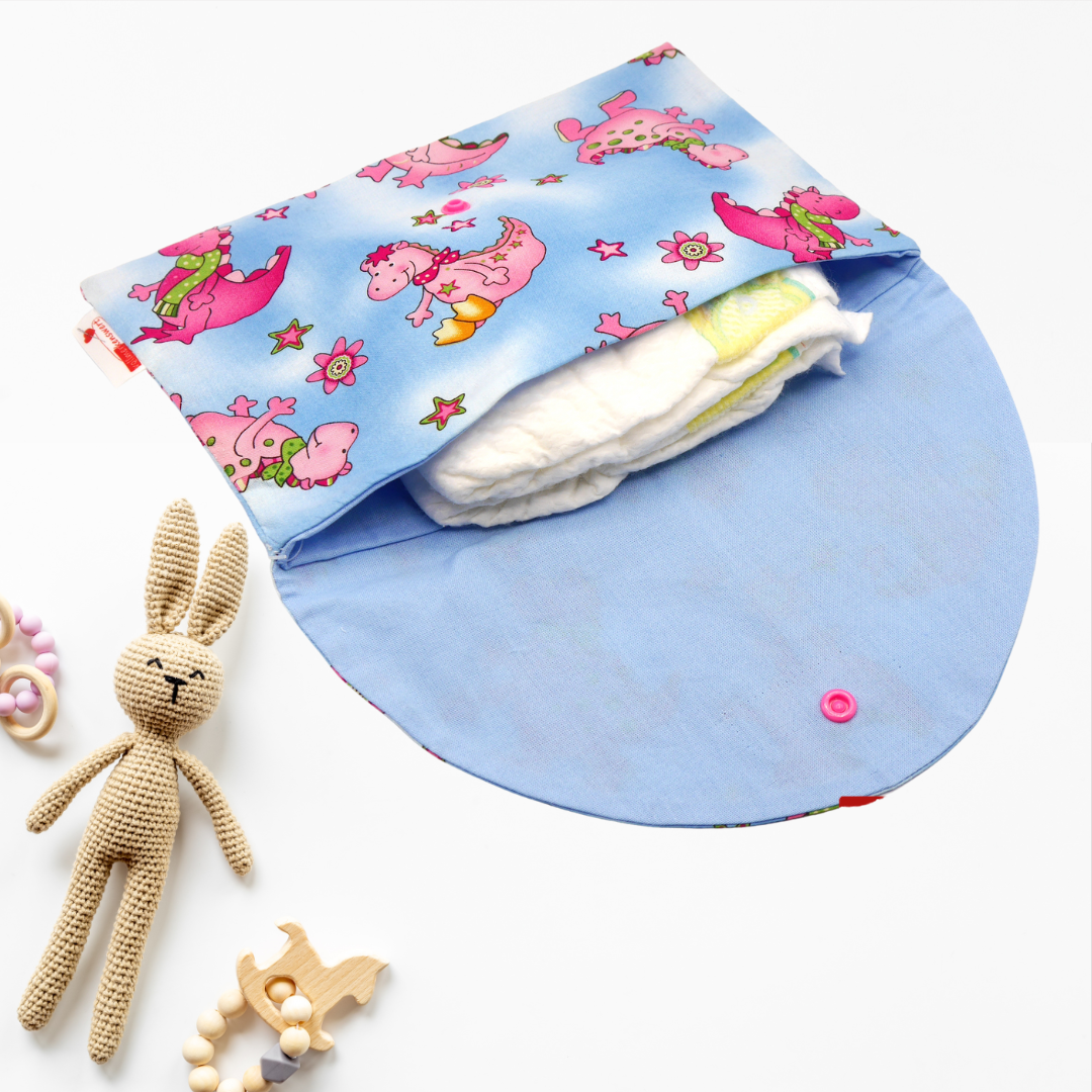 Diese wunderschöne Windeltasche haben wir aus einem hochwertigen Baumwollstoff mit niedlichen Dinos genäht.