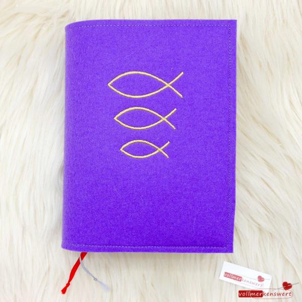 Hochwertige Gotteslobhülle aus 100 % Merino-Wollfilz in lila, bestickt mit 3 Fischen in gold.